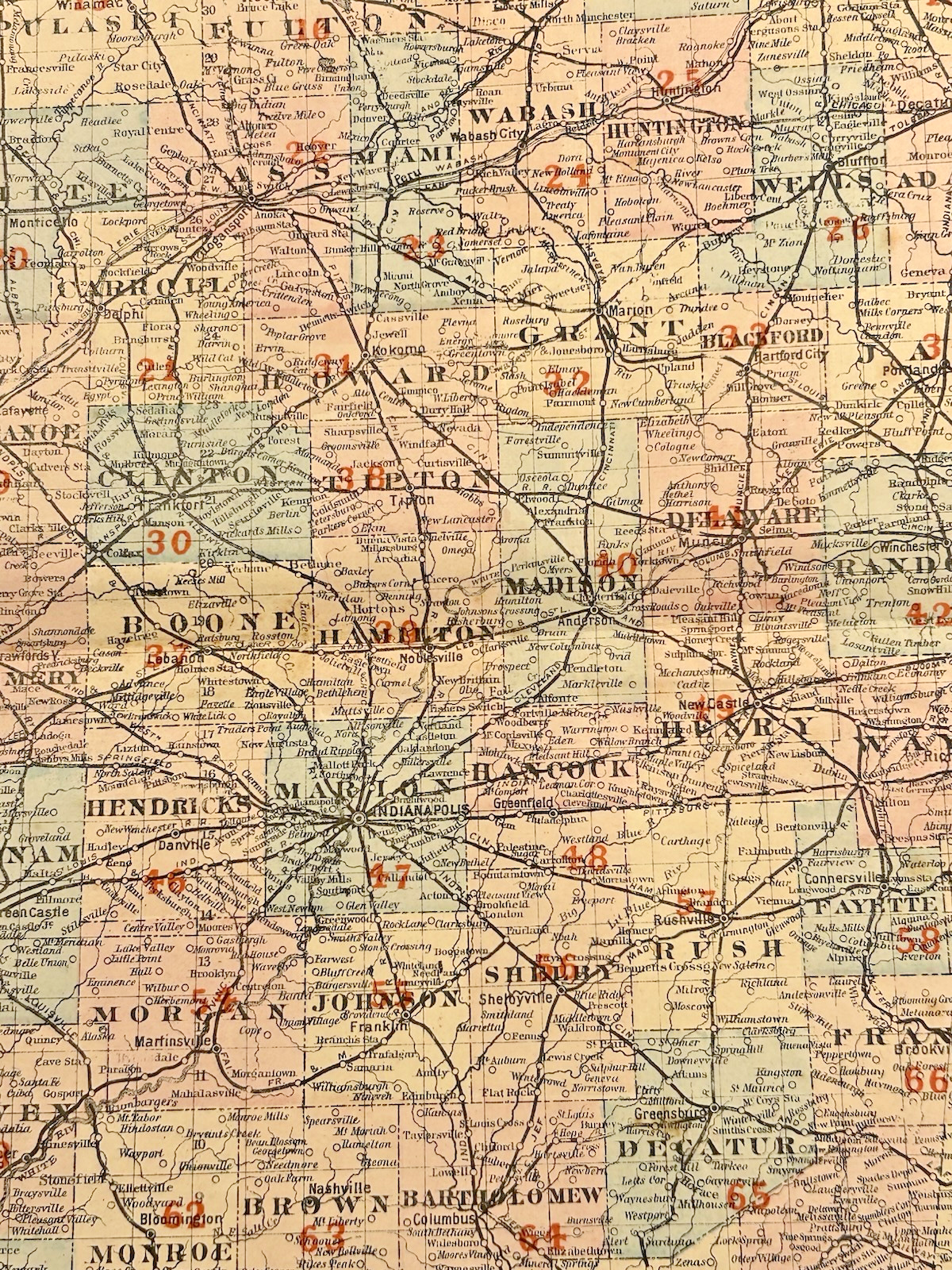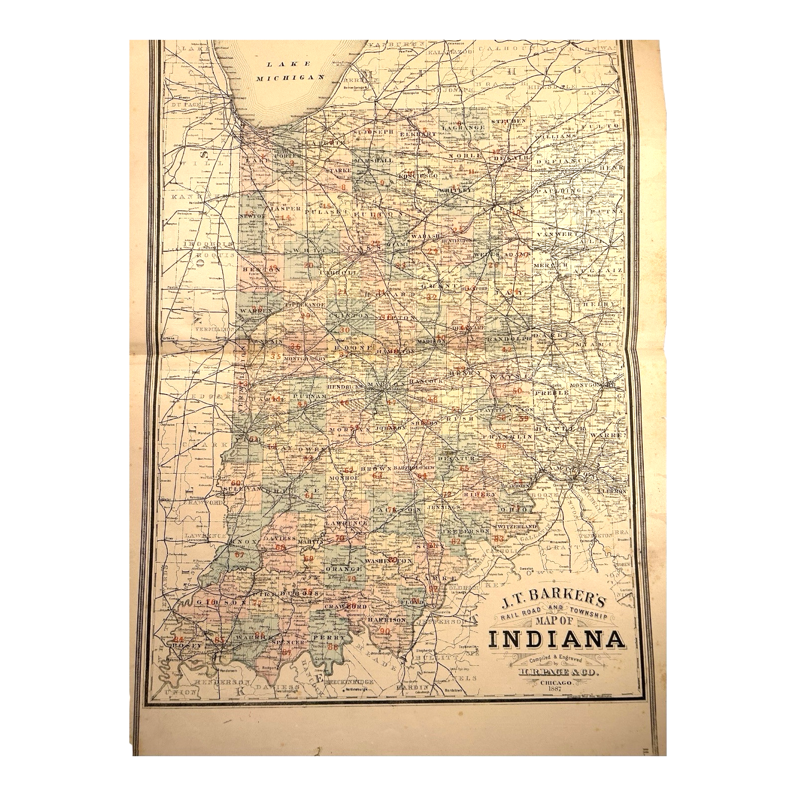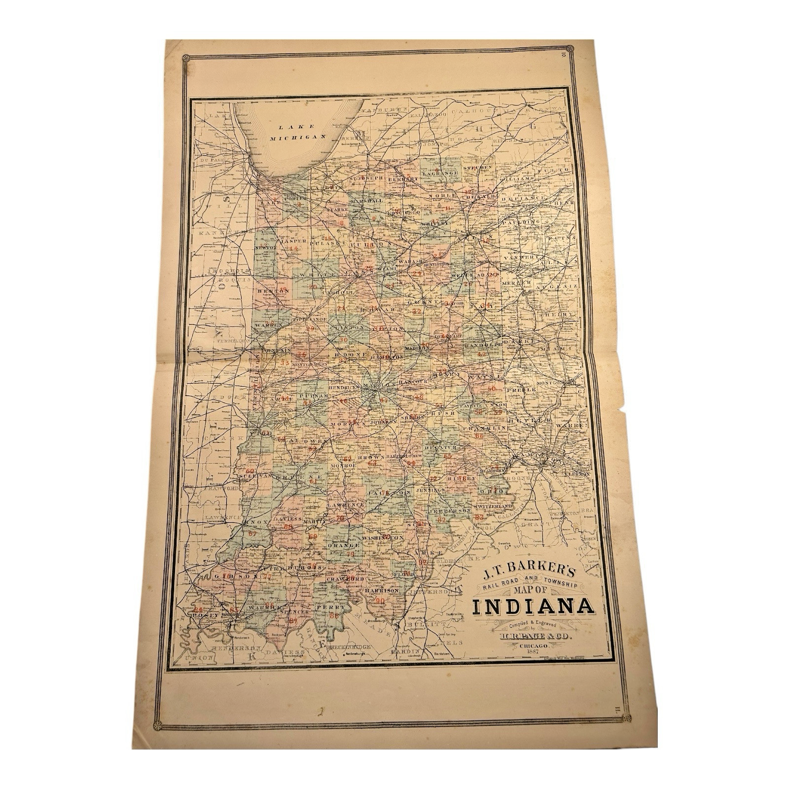 Antique 1880s J.T. Barker Railroad Map of Indiana – Colored Transportation Map