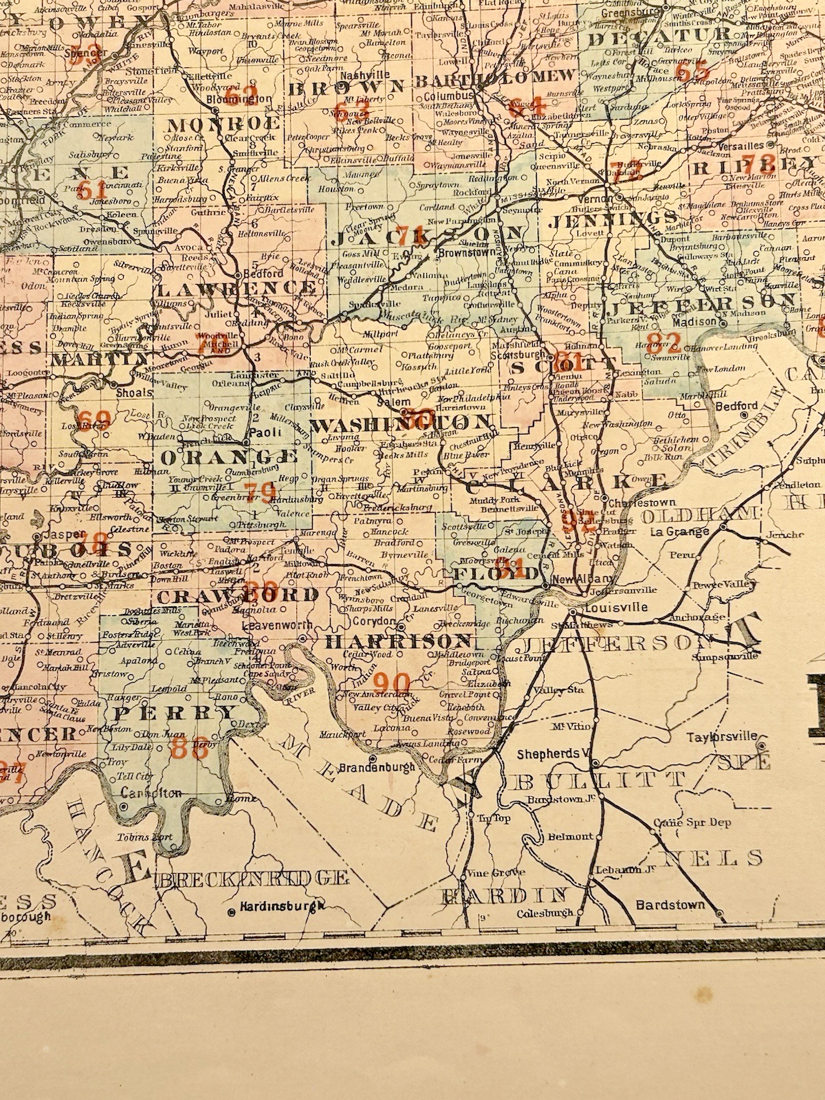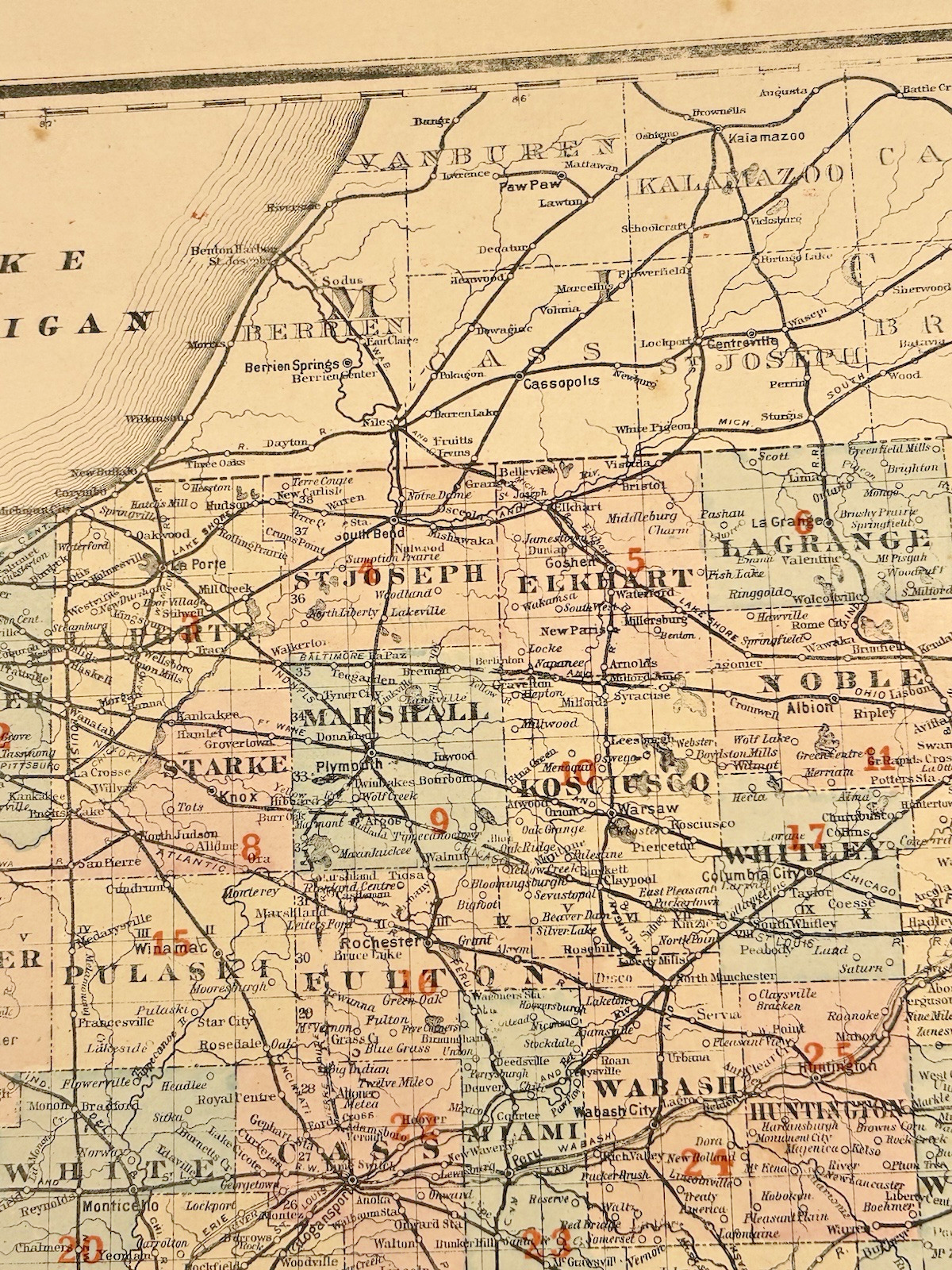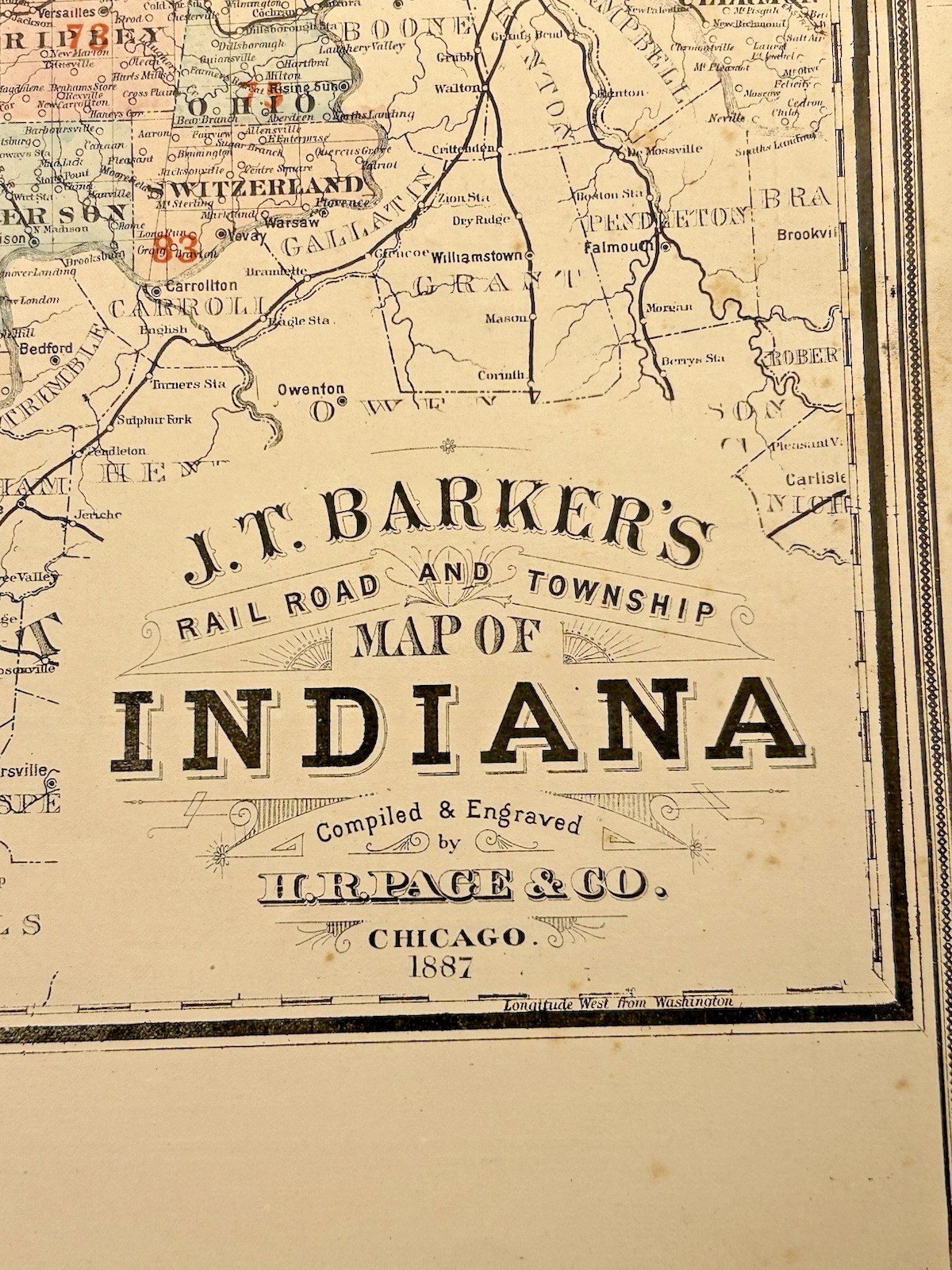 Antique 1880s J.T. Barker Railroad Map of Indiana – Colored Transportation Map