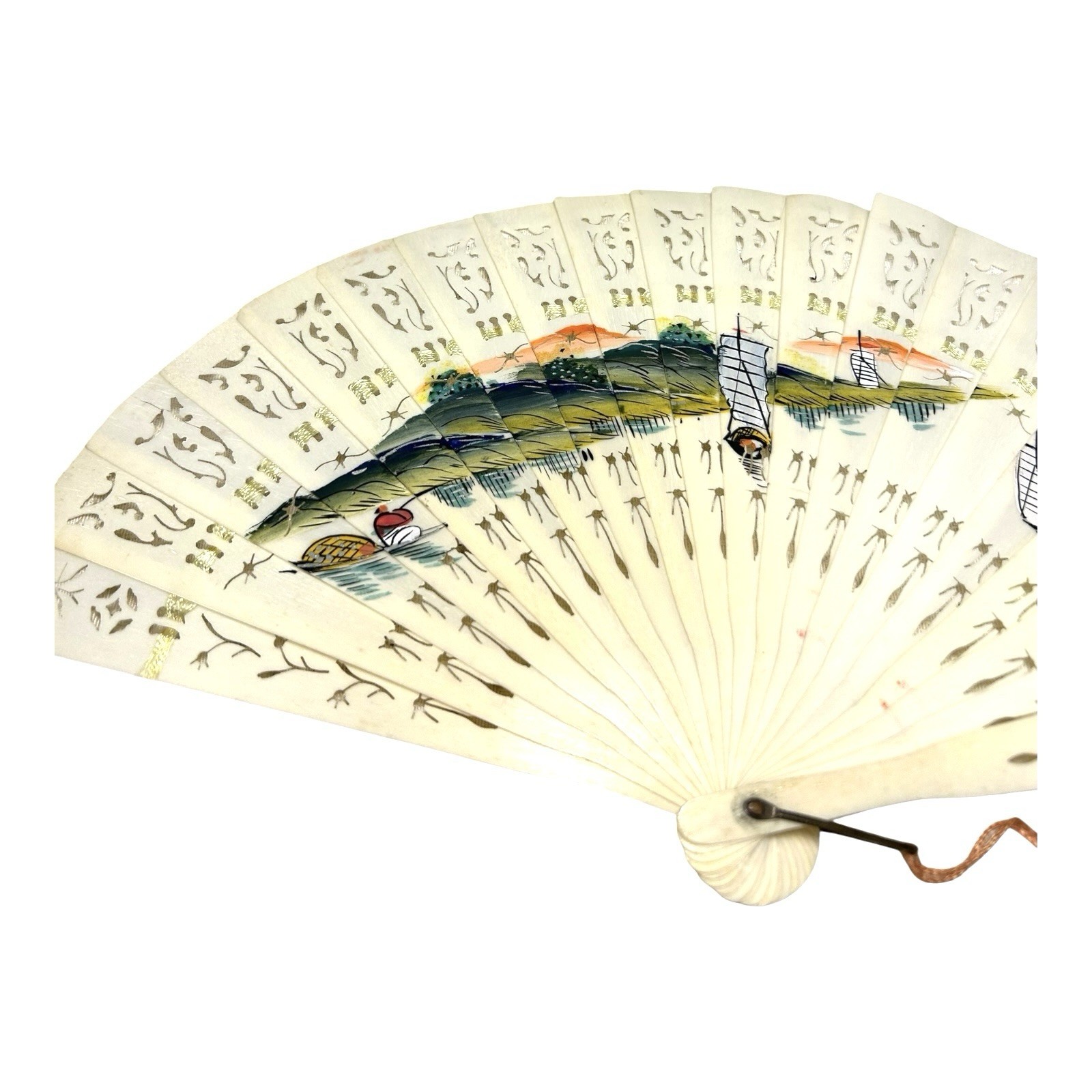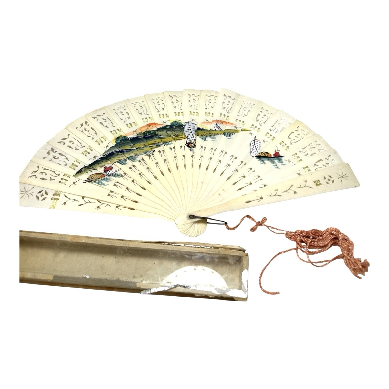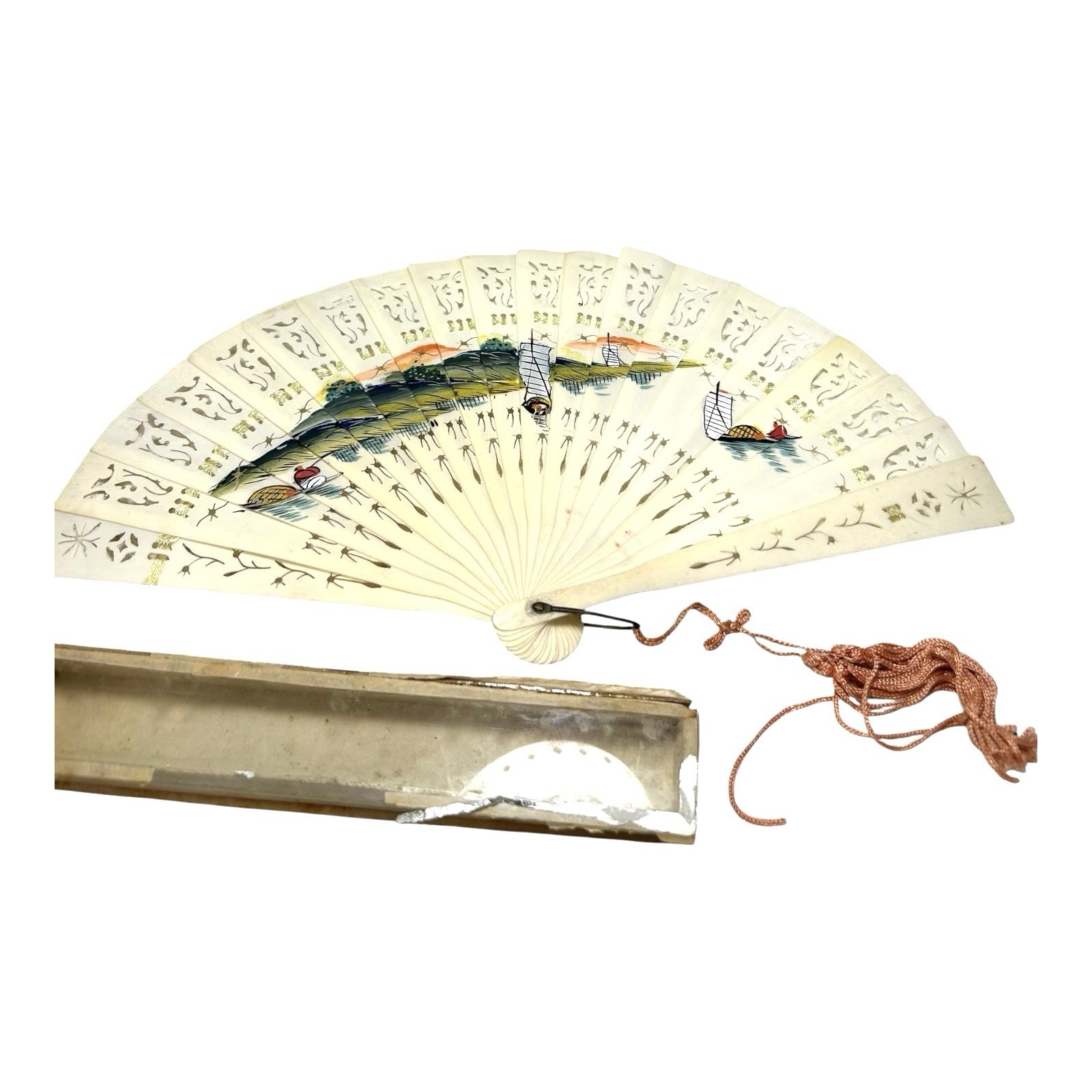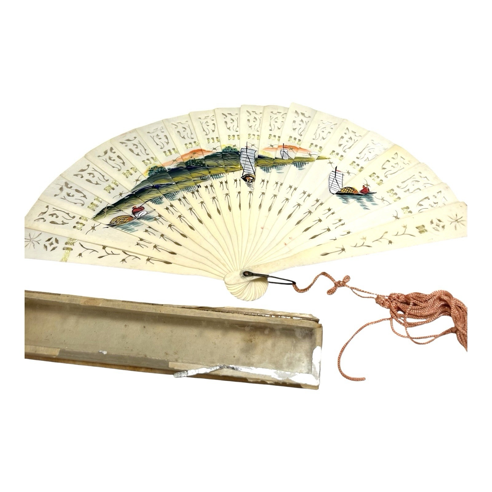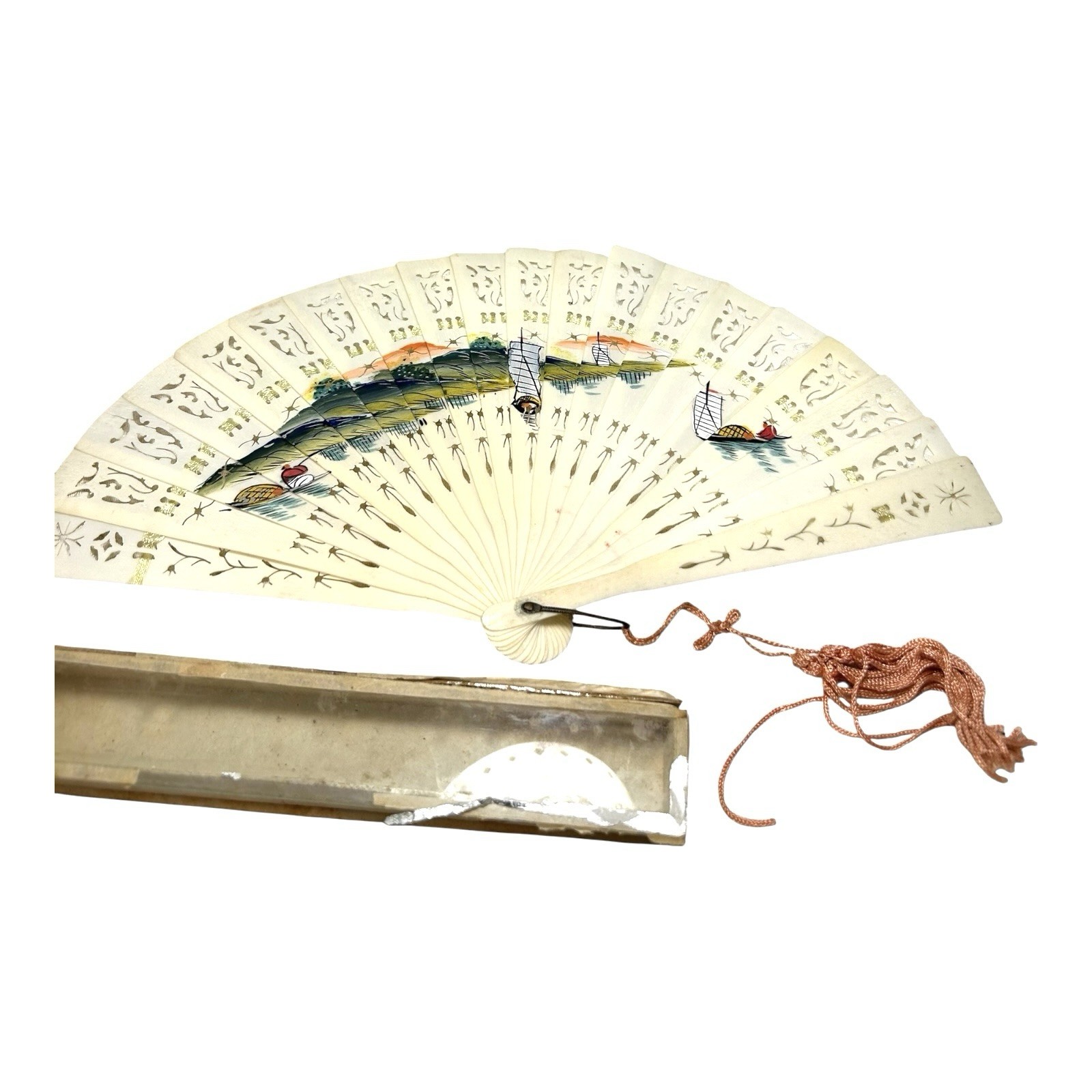 Antique Chinese Cellulite Hand Painted Hand Fan with Original Box