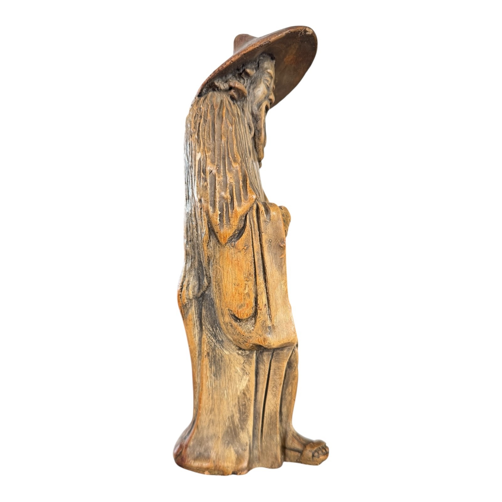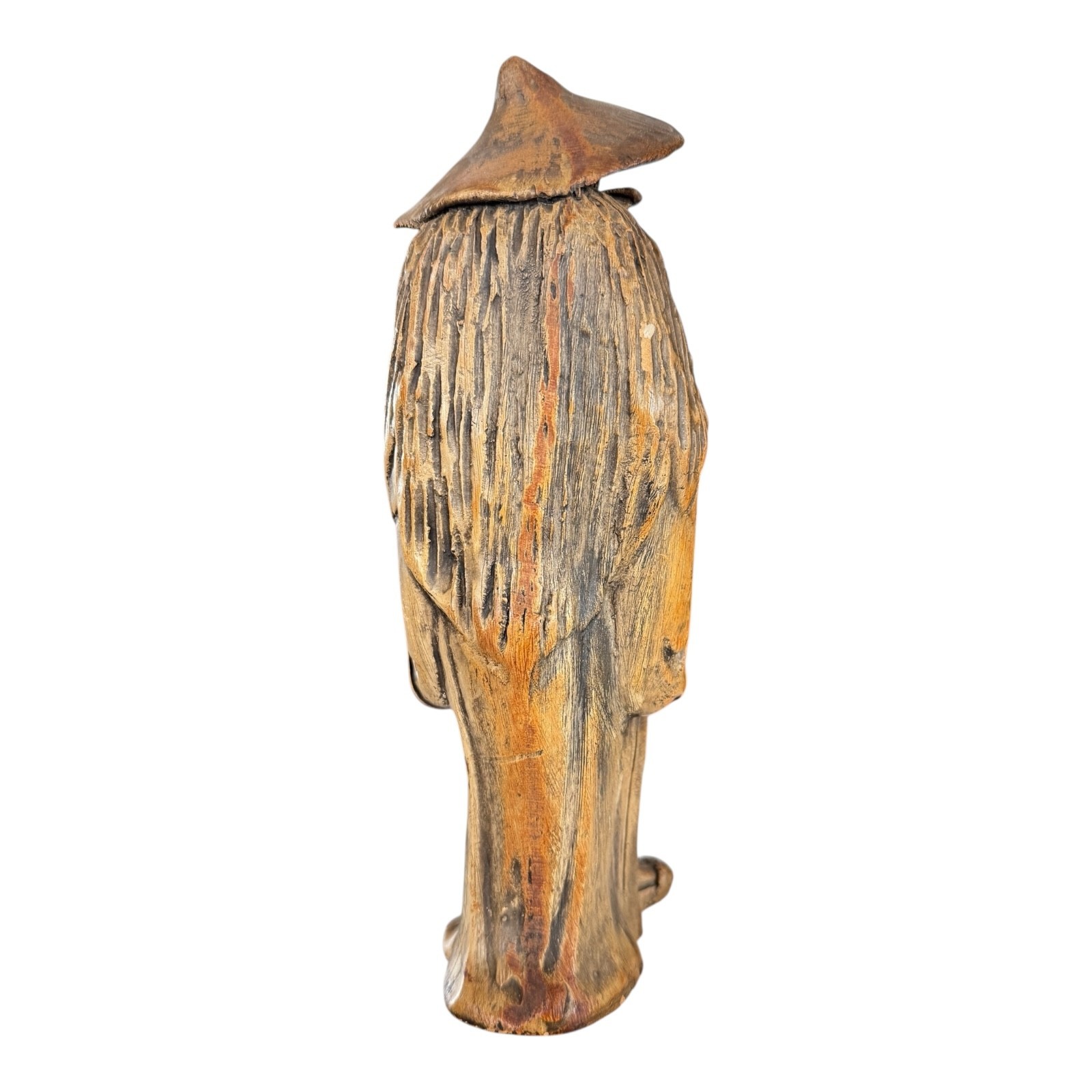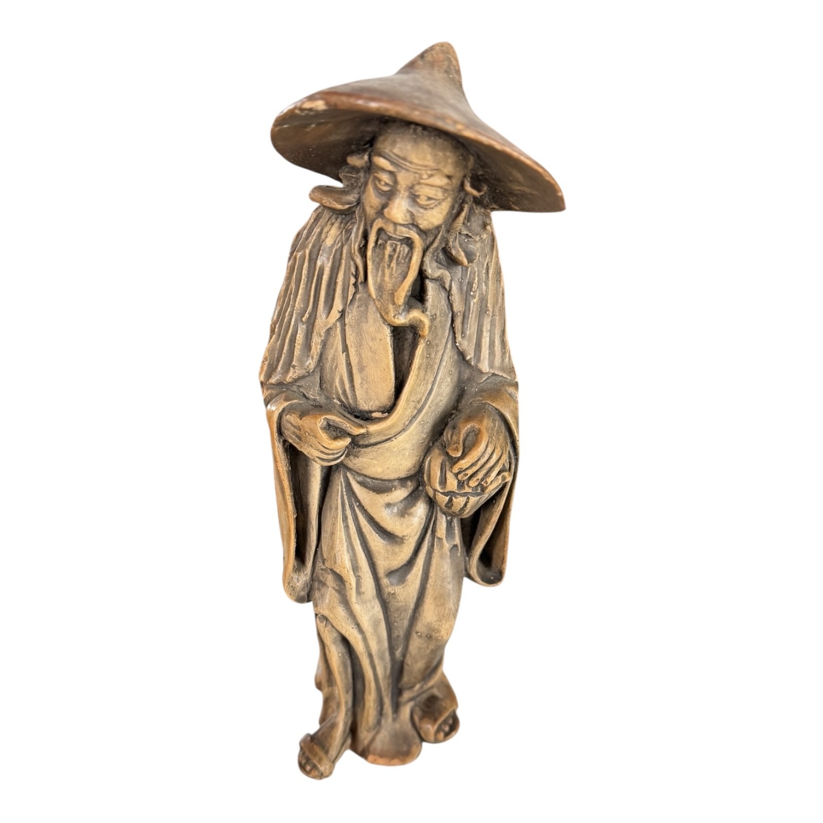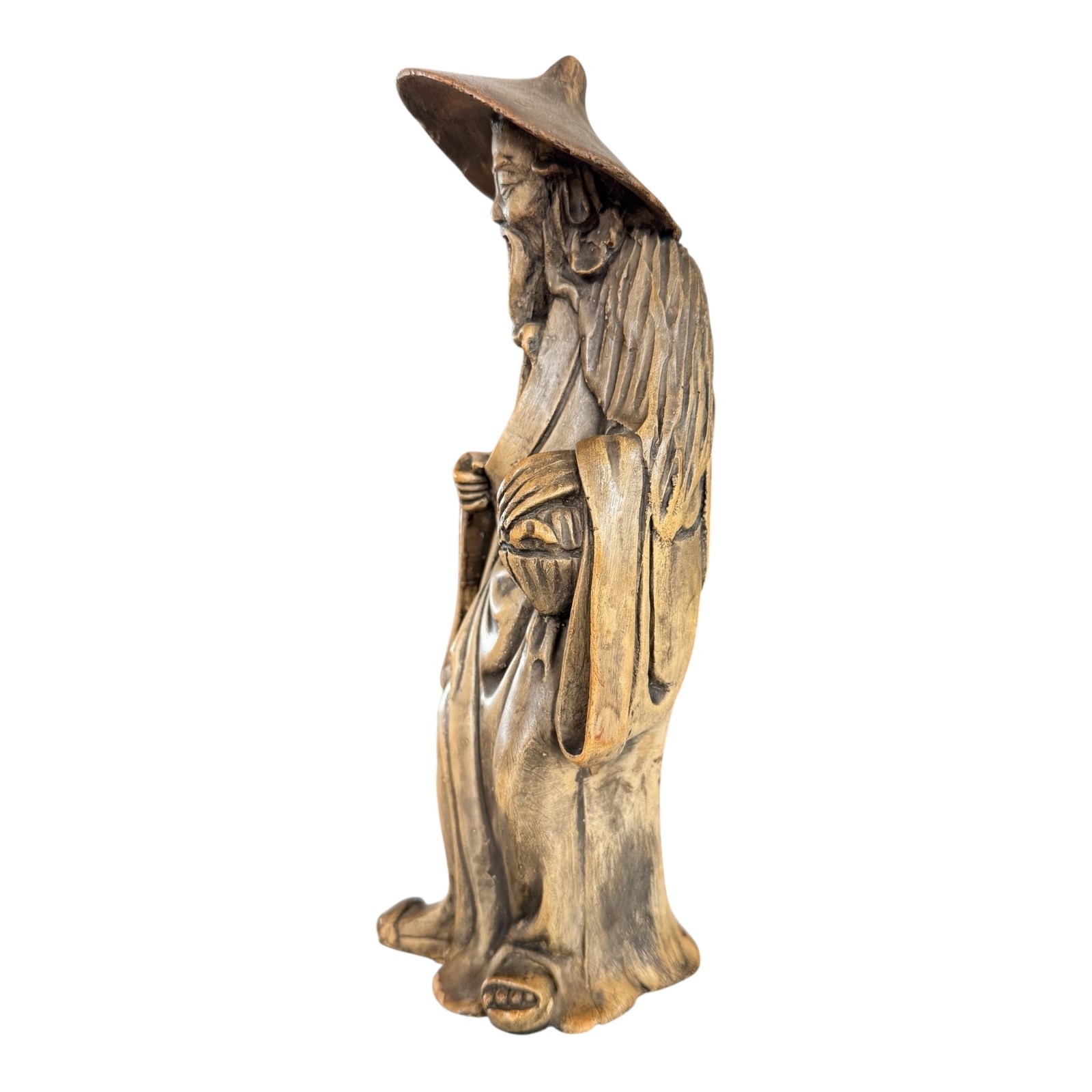 Chinese ceramic figural sculpture depicting a Daoist immortal or scholar figure, modeled standing with long beard, flowing robes, and traditional wide-brim hat. The piece features molded detailing with textured robe carving and a warm brown-toned surface treatment typical of mid-20th century Chinese export decorative ceramics often referred to as “mudman” figures. This style draws inspiration from traditional Chinese scholar and immortal imagery and was produced for both decorative and collector markets during the mid-century period.