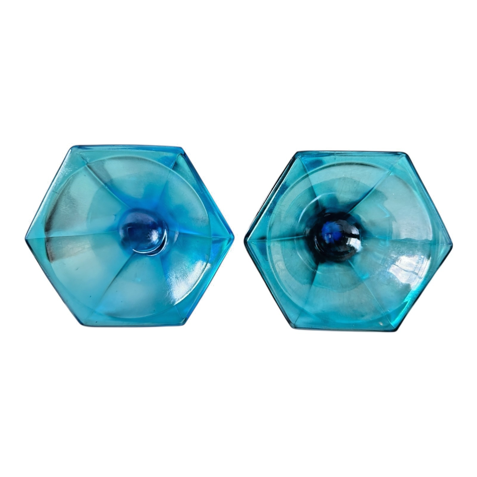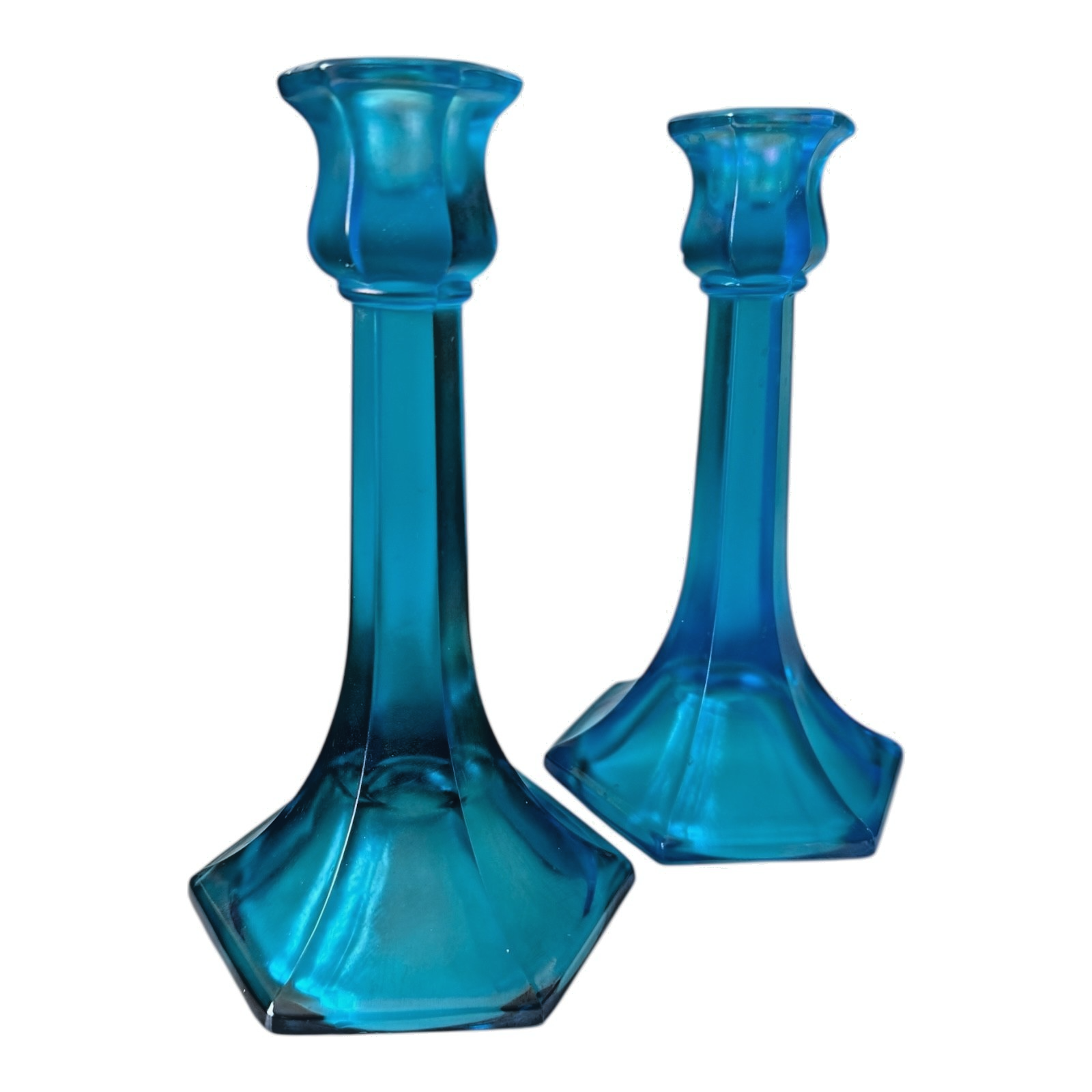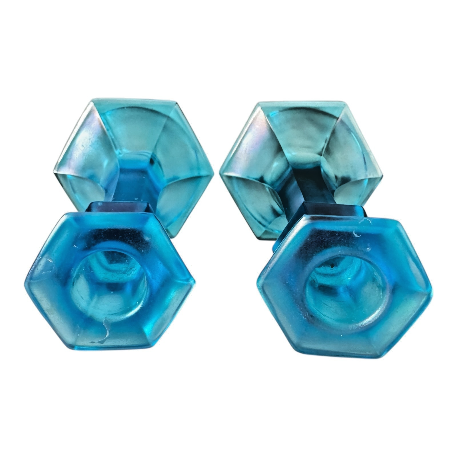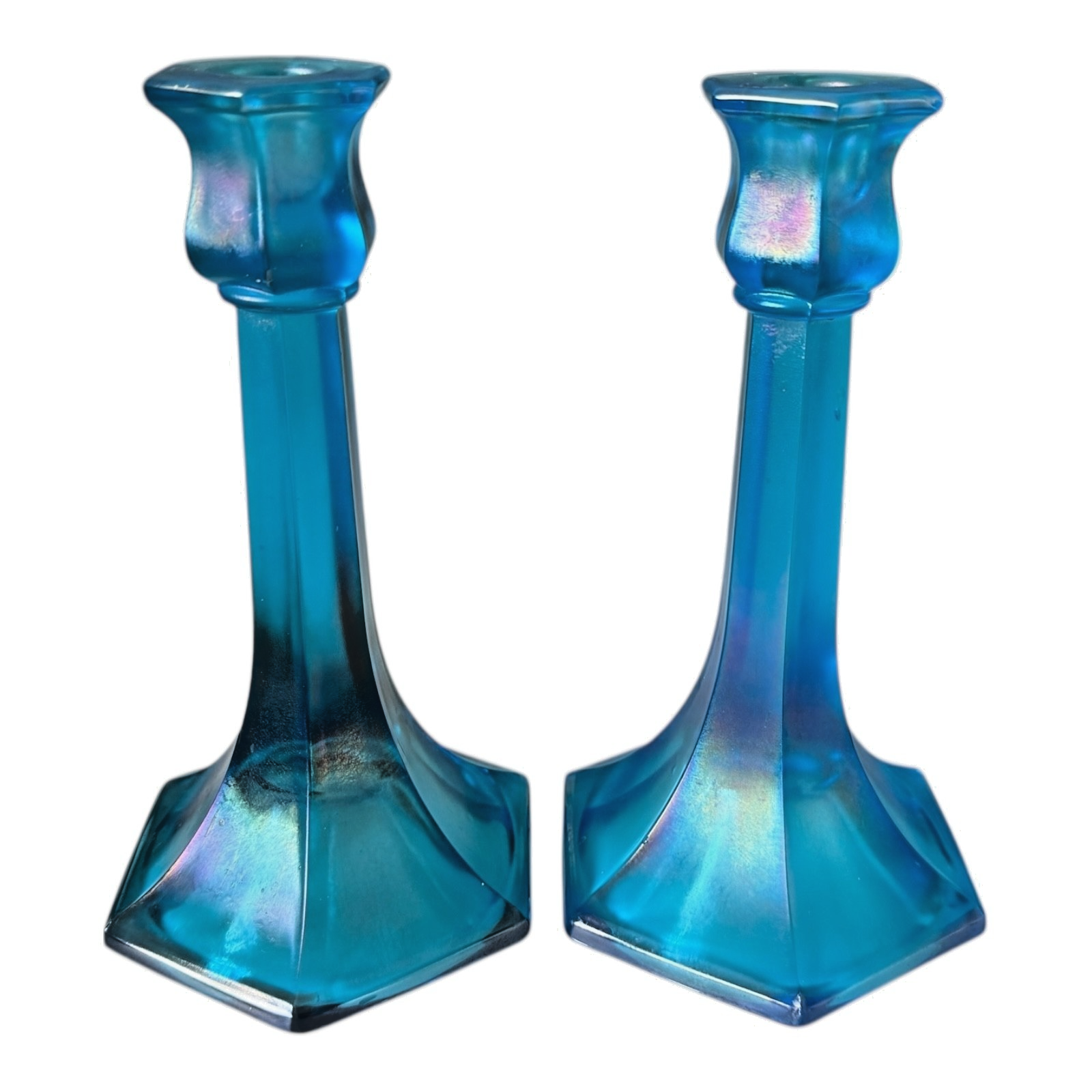 Elegant pair of Fenton stretch glass candlesticks in the coveted Celeste Blue color. Each features a satin iridescent surface with subtle rainbow sheen, a tapered six-paneled stem, and a hexagonal foot (classic 1920s Fenton form). Beautiful display pieces with Art Deco lines and luminous color.