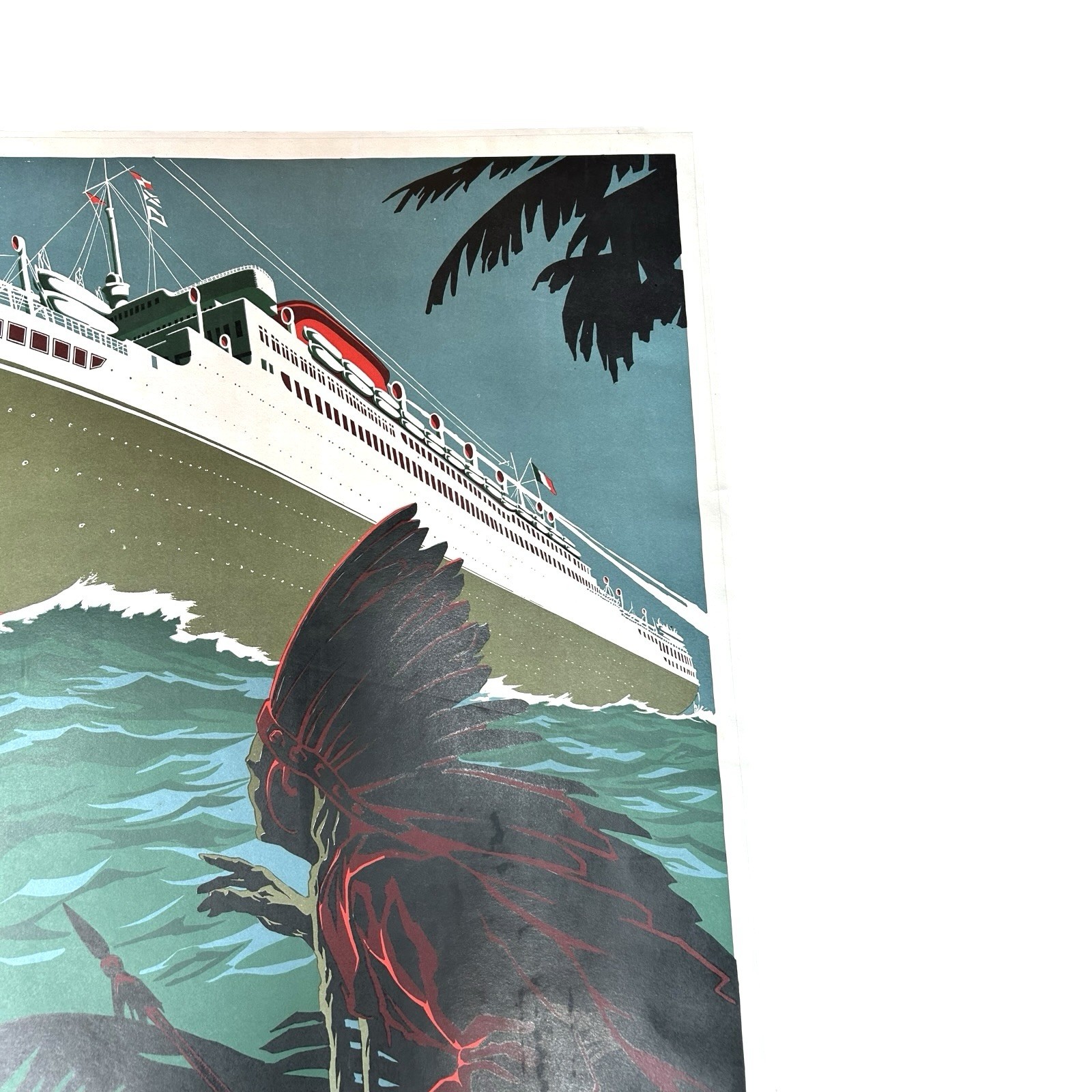 This antique original poster promotes the Italian Cosulich Ocean Liner Line’s Trieste service and features artwork by A. Dondoli, capturing the elegance and optimism of late interwar maritime travel. The design showcases classic Italian graphic sensibilities of the era, with refined composition and period typography that evoke luxury ocean voyages and international travel just before World War II. Linen-backed for preservation, this striking piece stands as a compelling example of European travel advertising and is well suited for collectors of nautical history, vintage posters, or Italian design.
