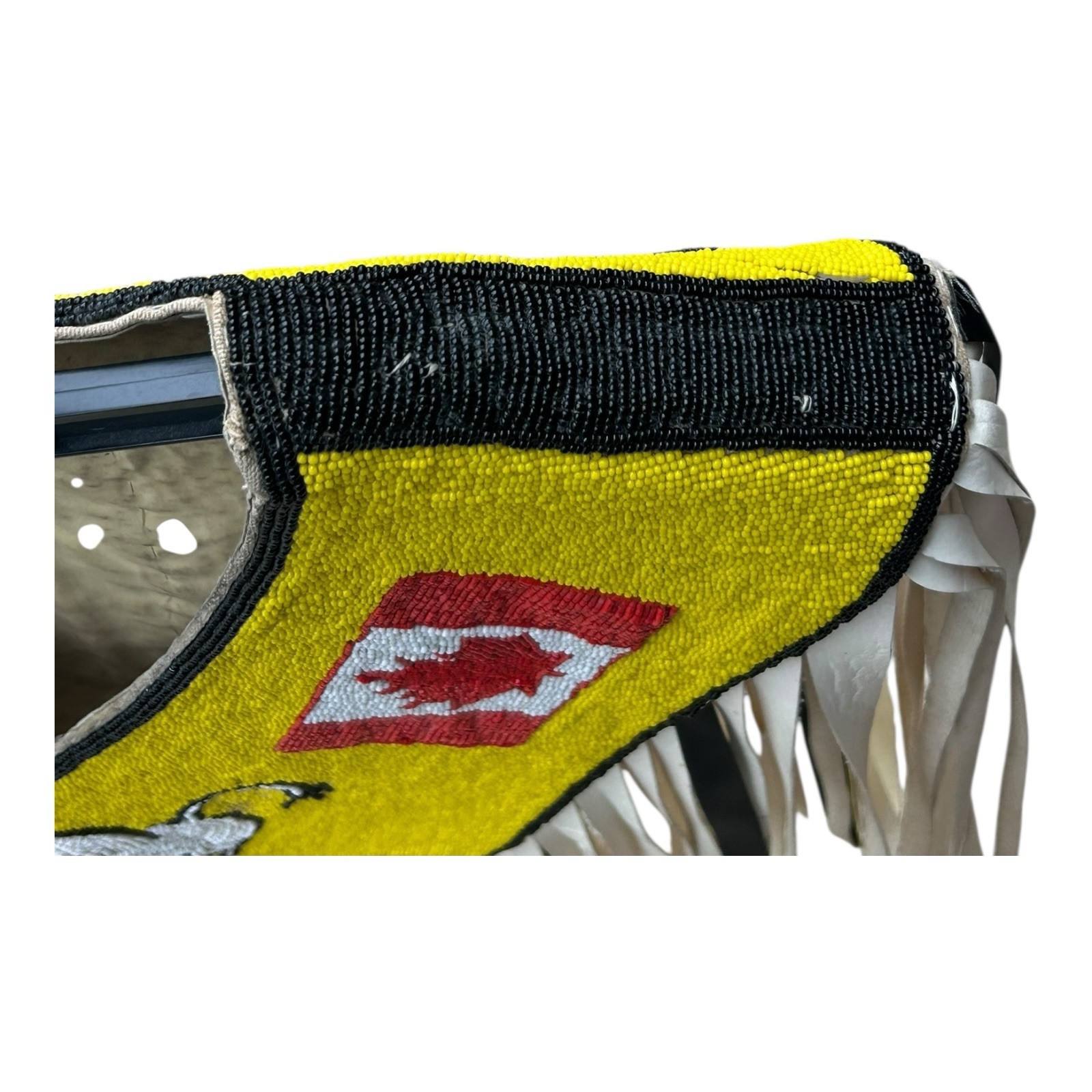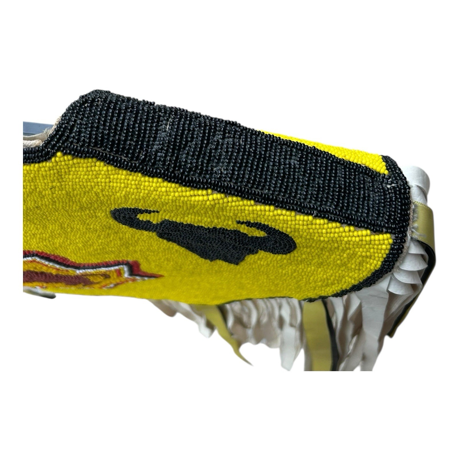 This vintage Native American Pow Wow regalia vest captures the artistry and cultural richness of Indigenous ceremonial attire. The intricate beadwork reflects traditional craftsmanship, with patterns likely representing tribal identity or ceremonial significance. Leather fringe detailing adds movement and texture, highlighting its ceremonial use. A beautiful and expressive piece that carries both history and artistry with authenticity and care.